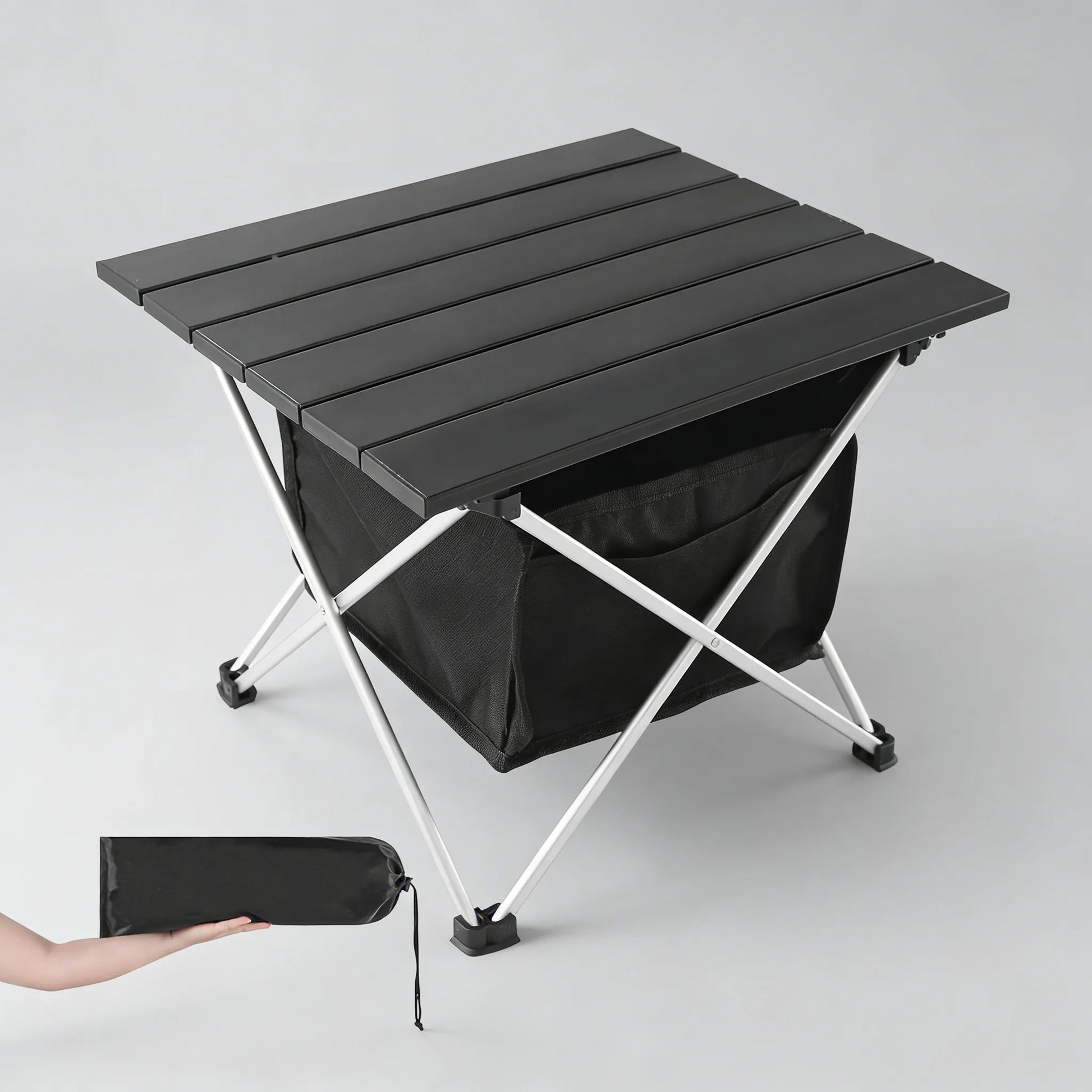 Built entirely from aluminum, this table is lighter than wooden camping tables of comparable size. Weights: Small 1.85 lbs, Medium 2.6 lbs, Large 3.3 lbs. Folds compactly into the included carry bag, ideal for stowing in a backpack or car—a stable surface for camping, beach trips, or use with portable chairs and stools.