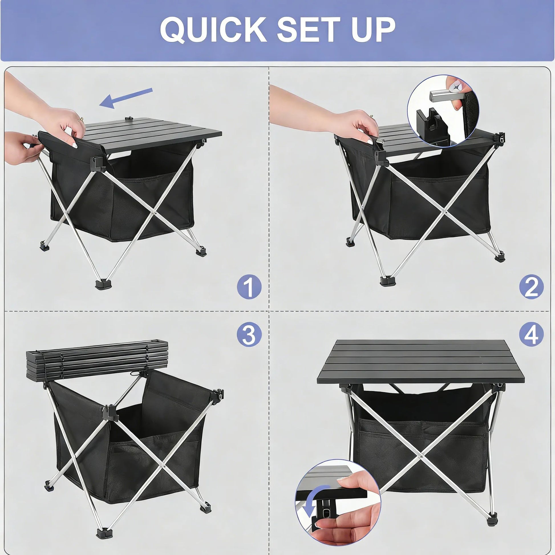 The table height matches most camping chairs and stools. To assemble, simply unfold the aluminum frame, insert the two rails into the grooves, and secure the tabletop. Perfect for home coffee breaks, beach outings, or outdoor meals.